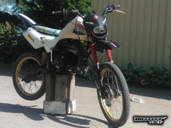 Elikkäs Helkama ax ja Suzuki s1 risteytettynä + paljon muita muutoksia, erittäin ärhäkkä ja kisainen luonne, nostaa keulaa erittäin arvaamattomasti, huippunopeus mitattu 109km/h gps:sään. Tekniikkana viilattu 74cc. Alusta loppuun itse rakennettu erittäin kestäväksi ja varmatoimiseksi!
