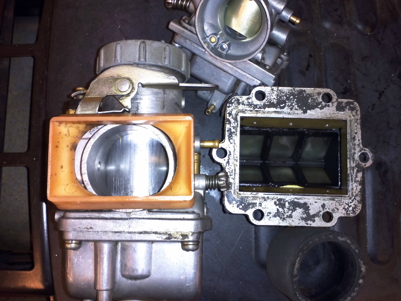 tässä vielä kuva läpärungon täytepalasta kaasuttimen päällä. sopii melkein suoraan. läpätkin vaikuttaa hyvin virtaavilta.