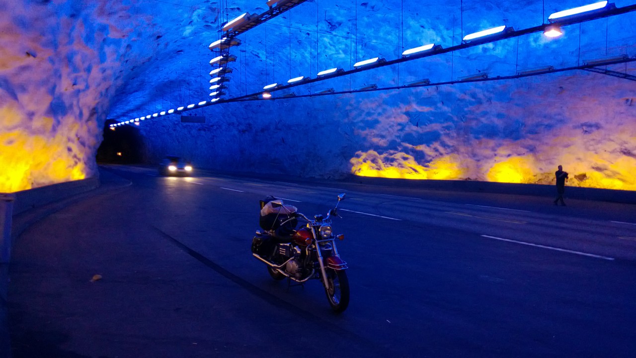 Yksi Lærdalin 24,5km tunnelissa olevista kolmesta levähdyspaikasta, aika hienosti valaistut. Tällä hetkellä tää on maailman pisin maantietunneli (edellinen, St.Gotthard-tunneli, on vajaa 17km).