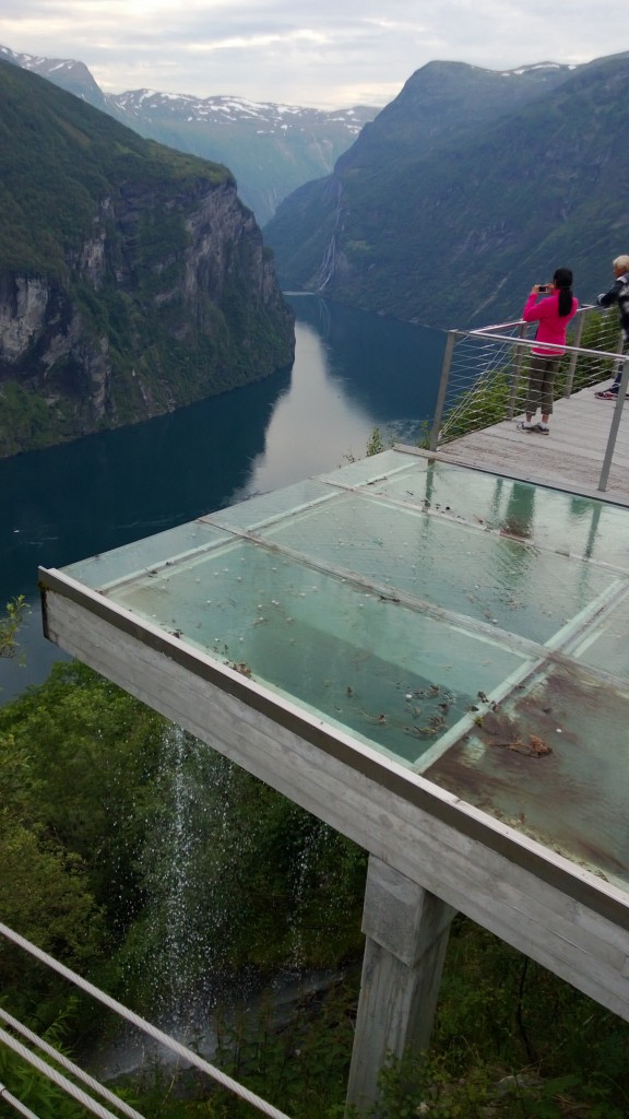 Geirangerista pois lähtiessä jyrkkä nousu ja tämä ørnesvingen-näköalatasanne. Puro ohjattu virtaamaan lasiosuuden kautta. Vuonon oikealla puolella kauempana "seitsemän sisarusta" eli vesiputousta jotka näkee vain laivalta kunnolla, niiden kohdalla vuonon pinnassa näkyy kuvassa putousten aiheuttama vana. Alkukesä oli Norjassa ollu sateinen, eli putoukset yhä aikas näyttäviä.