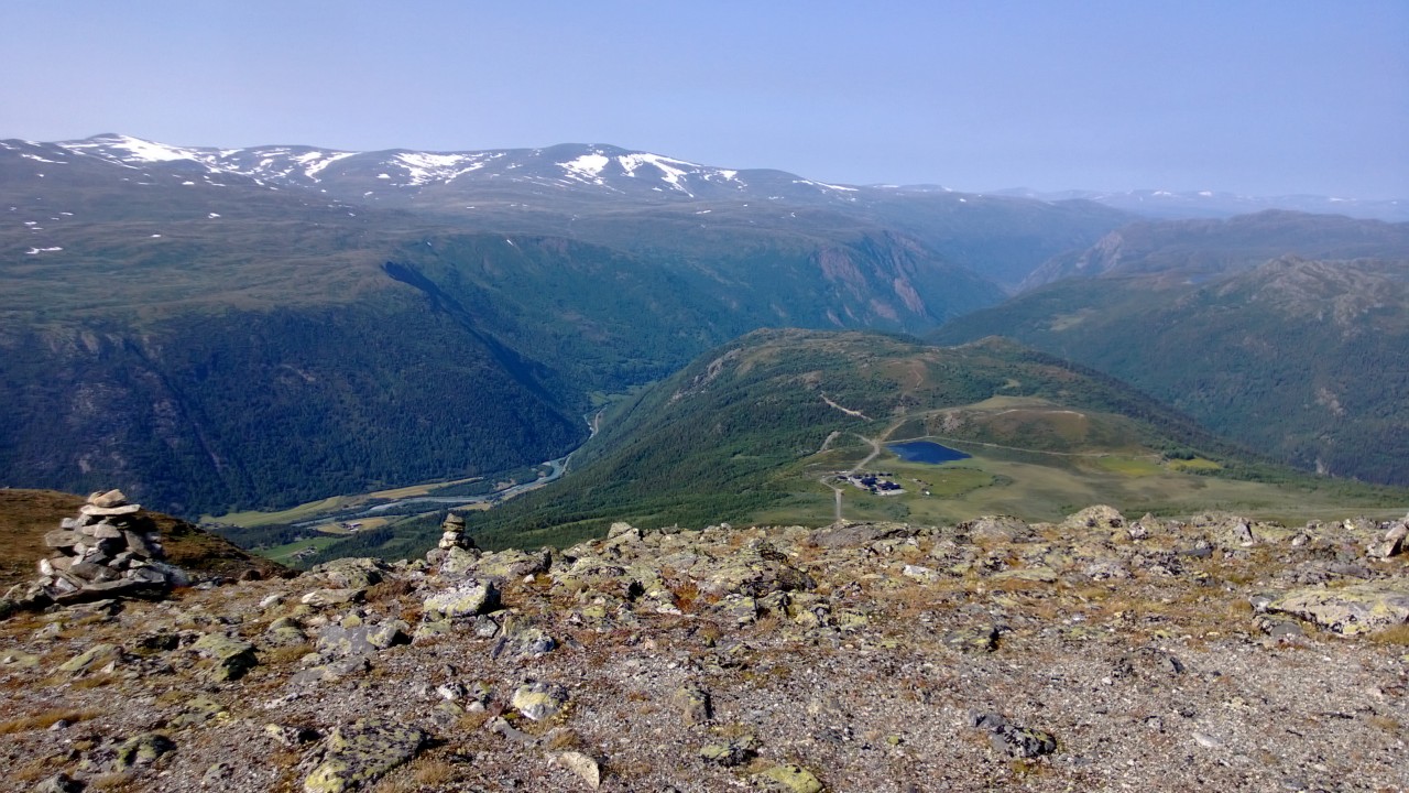 Nousu Juvasshyttanille, koneen jäähdyttely- ja kuvien räpsimistauko. Kokonaismatka laakson rv55:ltä on noin 15km ja nousua 1.000m (kuvauspaikasta mennään siis vielä usea sata metri ylöspäin, mutta laakson pohja ei enää näy tai ei ollu fiksua paikkaa pysähtyä). Shadow veti ylempänä enää 1-2 vaihteilla, 3:lla vain hetkittäin koska tie nousee päättäväisesti ja ilmakin alkaa ohentua (=seos menee paksuks, koska se on säädetty normaalille ilmantiheydelle). Tässä vaiheessa lähestyvän rintaman takia oli länsituuli alkanu voimistua, ja laakson tuulirännissä kävi aika puhuri. Keskellä järven rannassa olevan hotellin vieressä Juvasshyttalle vievän yksityistien maksupuomi. Tällaisia tienkäyttömaksuin ylläpidettäviä reittejähän Norjassa on paljon muitakin, esimerkiks tie Dalsnibban näköalapaikalle Geirangerissa tai Per Gynt-reitti Lillehammerista luoteeseen (mikä ehkä tulee ajettua jollain seuraavalla Norjan exculla). Kuva ei valitettavasti vangitse kuin pikku osan panoraamasta. Onko retki 65 NOK väärti, no jaa, ylös mennessä kone ja kytkin saa löylyä, alas mennessä jarrut kärtsää, ja perillä "outdoors"-vaellusväkeä jotka tais katsoa nuhjuista motoristia ku halpaa makkaraa. Tie on serposahailua, vähän tylsä. Maisemat toki ihan hienot, eikä tuon korkeammalle (~1.840m) pääse Pohjois-Euroopassa tietä pitkiin missään muualla. Your money, your call.