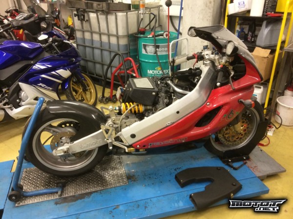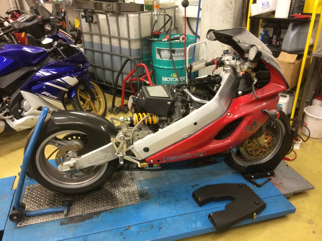 Tukkoisa kaasaripatteristo otettu irti ja ultraäänipuhdistettu sinne vähien ajojen takia kertyneen töhnän takia, kuvassa tätä varten apurunko takaa irrotettu. Itse runkohan on Bimotalle tyypillinen tuhti SLC mikä yhdistää ohjausakselin ja svingin, alunperin ensiesitelty 1980-luvun puolenvälin YB-4:ssä. Annoin ammattilaisen "detaljoida" säilytyshallissa pölyttyneen pyörän tosi hienoks tän kaasariprojektin jälkeen. Mahdollisesti se tulee näytille Starbike/Dynomight messuständillä kiitoksena hienosta työstä.
