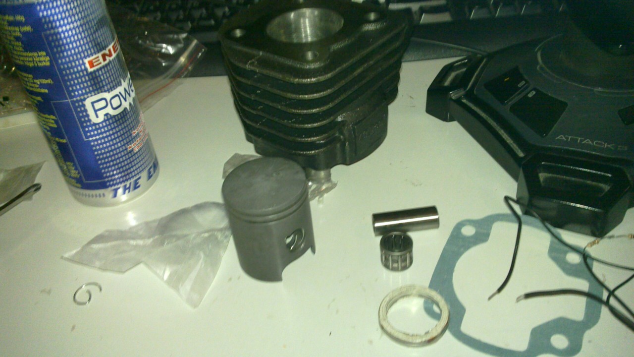 TNT 50cc pyttysarja easypartsilta 34e+pk... Tuli kaikki tarvittavat mukana, vieläpä ylimääräinen imukaulan tiiviste, paitsi neulalaakeria ei tullut. Kuvassa ei näy kaikki mitä tuli. Pytty varmaan ihan ok, männässä taisi olla jopa jonkinlainen grafiitti mikälie pinnoite, sen takia se onkin tuommoinen harmaa. Hyvin on toiminut ainakin 100km ajan. Männän vois kattoa jossain välissä.