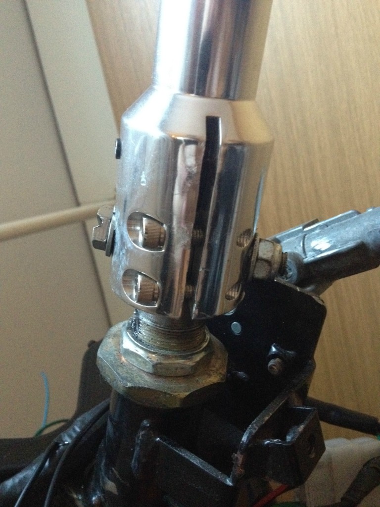 Adapterin sisähalkaisija oli liian pieni. Eli otin porakoneseen hiomaterän ja suurensin sisähalkaisijaa ja sittenhän se meniki :D Tuo pultti on tossa varmistamassa ettei pääse löystymään noi ruuvit mi...