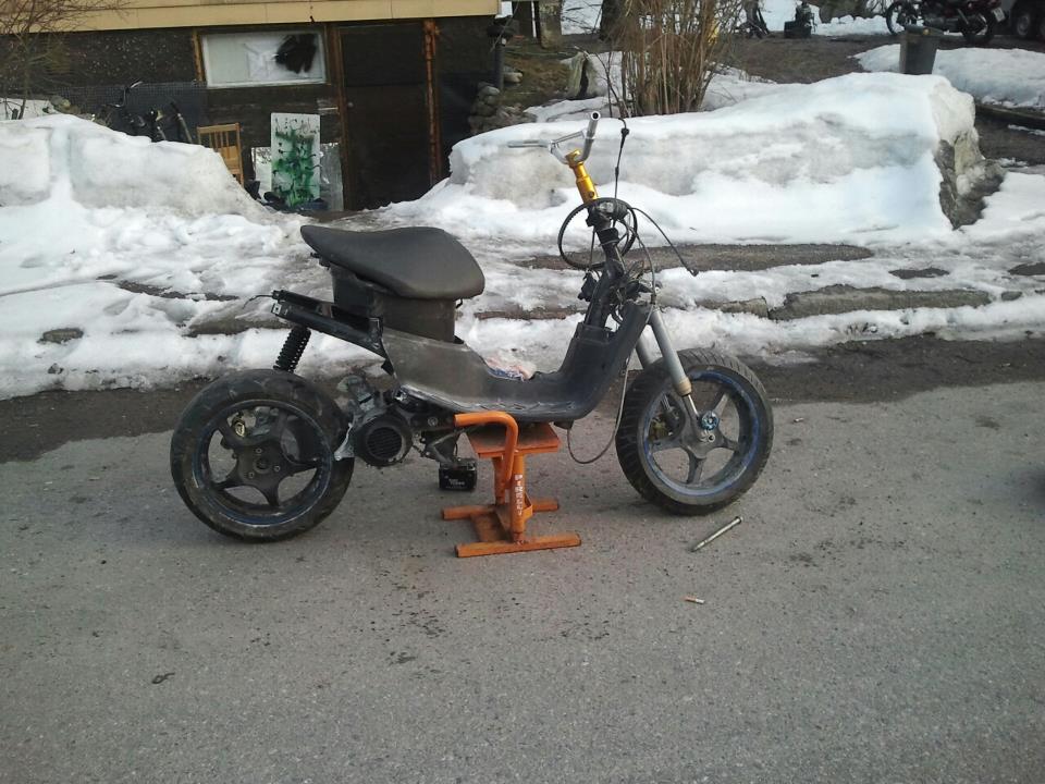 idea vanteisiin tuli siitä että oli pakko saada parempi jarru taakse kun keulii mutta kun levyjarru projekti aloitettiin nii huomattiin että joku mopossa on niin kierossa että tällä läjällä keuliminen on suht mahdotonta. no mut nyt mulla on levyjarru ?