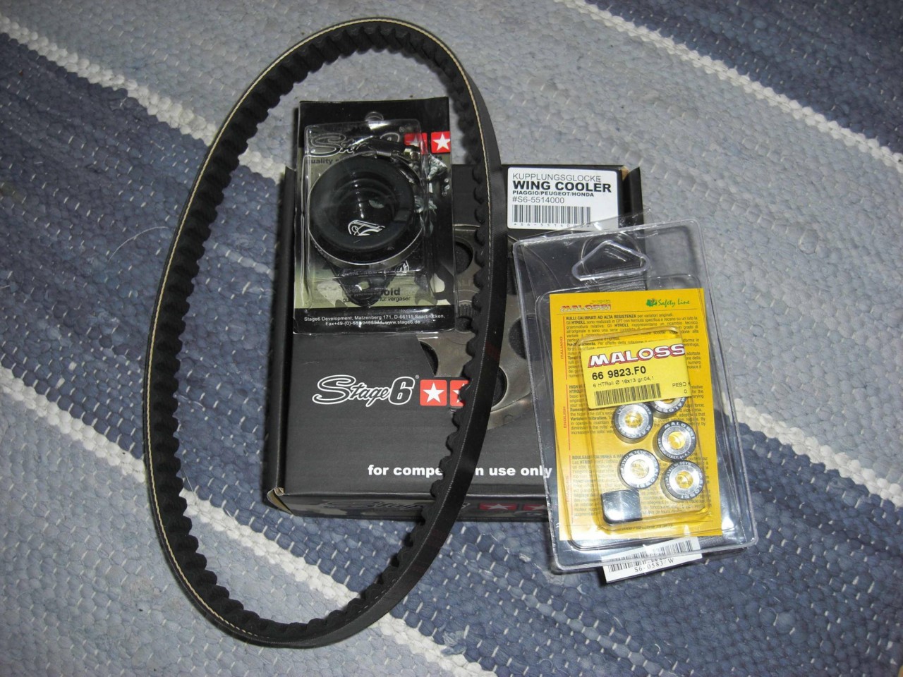Malossi X-Kevlar, Stage6 WingCooler, kaasuttimen adapteri 22 milliselle ja paketti Malossin erittäin hyviä rullia. Suosittelen!