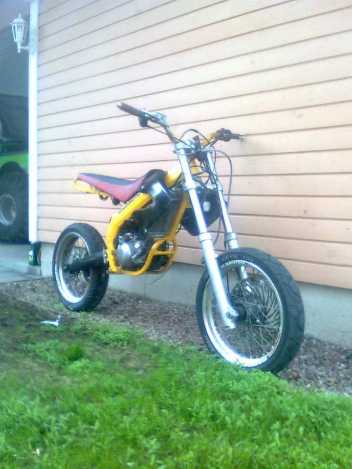 Tuossa kunnossa tällähetkellä. Vinkkejä tarvis jatkoon, Etulokari olisi oltava mallia pieni ja timmi, mistä vehkeestä? Vanteitten väri? Maski? ylä vai alakauttanen putki. Yleensä risuja ruusuja ehdotuksia otetaan vastaan. Niinsanottua hyperderbiähän tästä ollaan tekemässä.