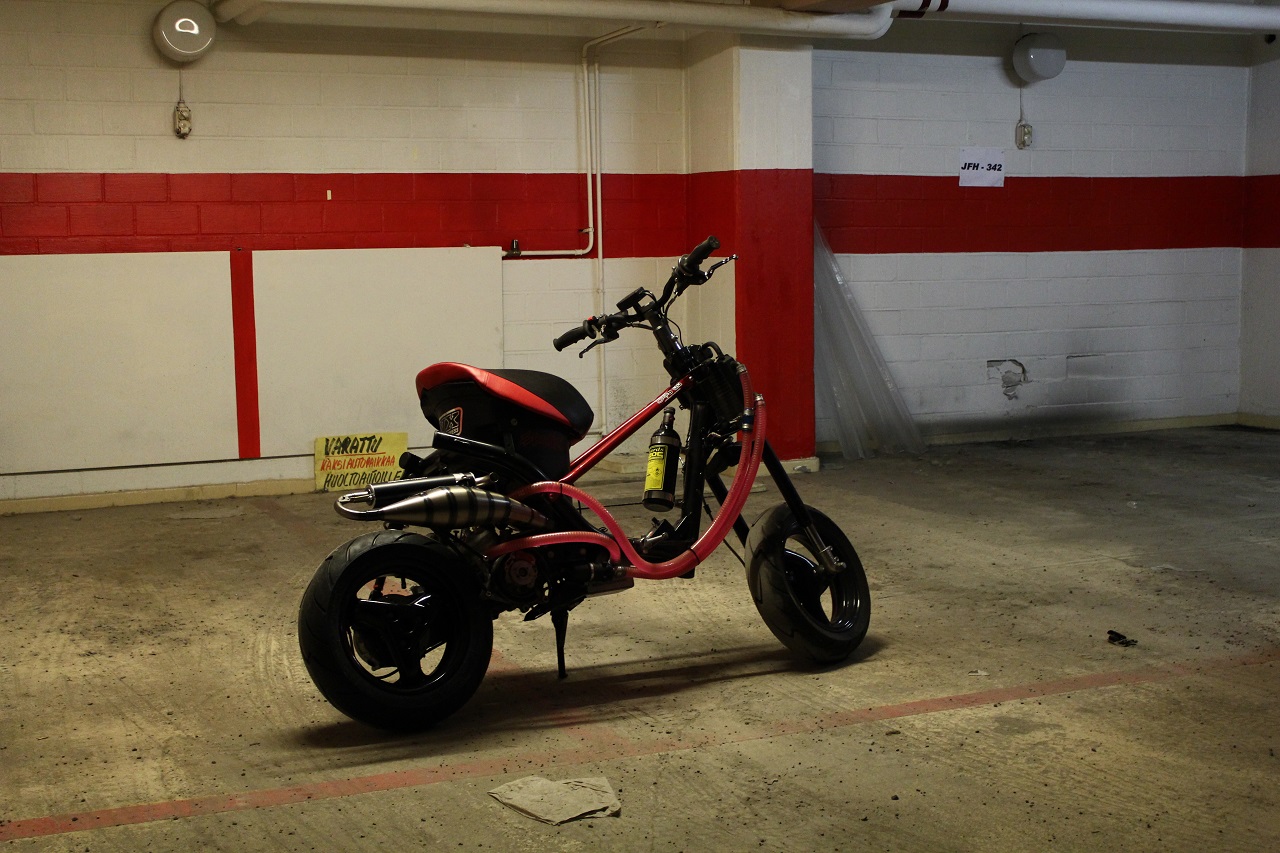 Tuli NOS-järjestelmääkin testattua, tosin ainostaan paikallaan koska bensapumpun aiheuttama liian suuri paineistus pakotti neulaventtiilin toimimaan väärin. Pitää vissiin ostaa pienempituottoinen pumppu. Joka tapauksessä hyvin vingahteli kun antoi ilokaasun virrata, ja käyntiäänikin muuttui terävemmäksi. Kyllä tuolla setillä tehoa otetaan..