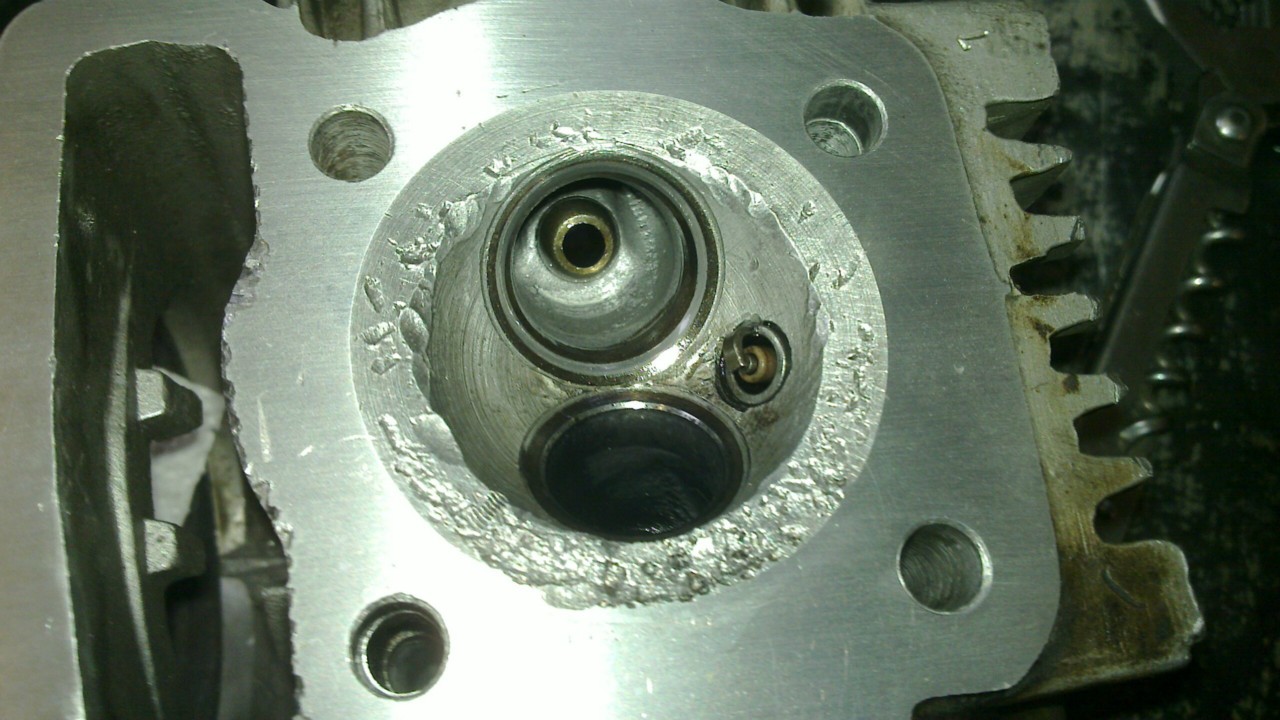 Tältä näytti palotila putsauksen jälkeen kun eka kerran avasin koneen :D Mitä ilmeisimmin kaasarin ryyppyläpän ruuvi on joskus irronnut ja imeytynyt koneeseen ja pistänyt paikkoja paskaksi, koska kaasarista puuttuu ryyppyläppä ja nuo jäljet näyttävät aivan kannen ja männän väliin joutuneen ruuvin jäljiltä. Ilmeisesti tuon jälkeen ainakin mäntä vaihdettu uuteen..