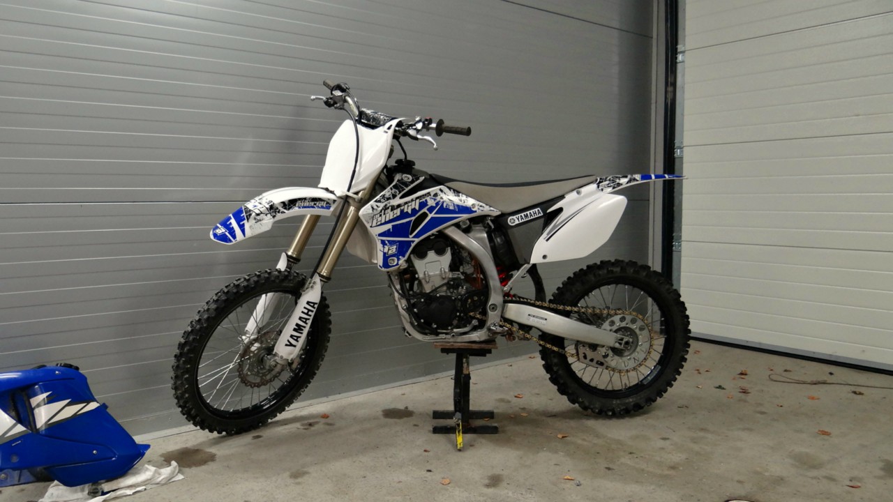 Innostuin vähän siistimään ulkonäköä, takakehän reunuksen maalasin mustaksi, revin numerot katteista ja teippasin ne valkoiseksi. Pumpunsuojiin tuli kanssa yamaha tarrat, tosin ne ei siinä risukossa pitkää kestäneet. :D