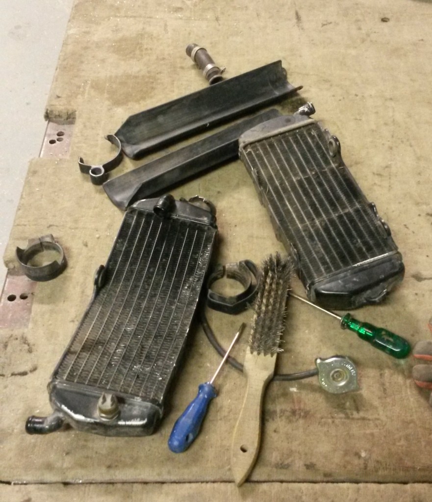 Syylärit irrotuksen jälkeen. Nestettä ei sisällä ollut nimeksikään, ja toinen oli vääntynyt - ilmeisesti ajettu pyörä nurin jotain vasten. Puhdistus ja kuumakestomaalia pintaan, oikaisemaan en lähtenyt, kun osui hyvin kohdalleen kiinnikkeisiin.