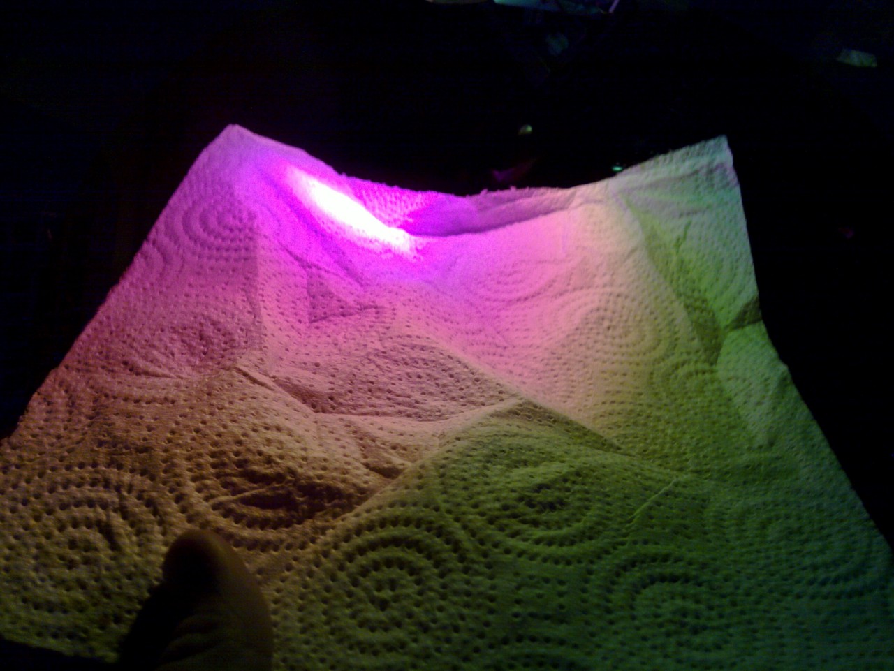 melko jännän väriset noi halogeenit. Keskeltä liilat, reunoille heijastuu vihreetä ja sitte tonne maskin taakke ihan normaalia keltasta ja jos valoja katsoo nii sillonki ne näyttää keltasilta.
