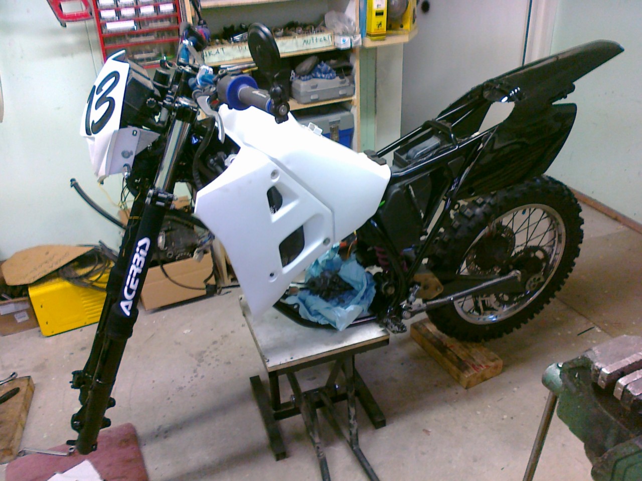 Semmosta, tämän syksyn räpellyksiä. Runko hiekkapuhallettu ja maalattu mustaksi, kone remontin alla nyt (EHJÄ vasen lohko hakusessa, tarjota saa!!) Kotarin takakatteet tuli hommailtua myös ja muutakin osaa.