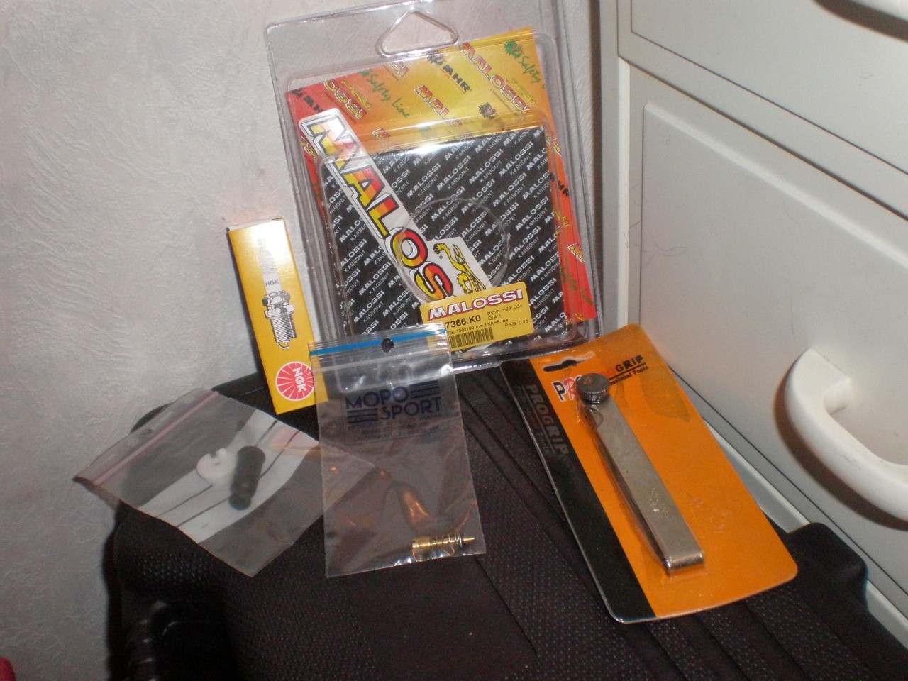Malossi karbonlevyä (0,30mm), ngk bp7es, rakotulkki, seosruuvi, ohjain ja suojuskumi dellortoon