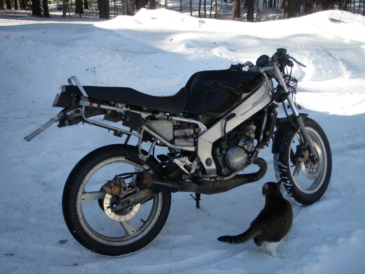 Löinpä tessun tulille talven seisonnan jälkee=) pitäs jonkuu verra fiksailla tota enne ku lähtee baanalle:) Niiku esim pakoaukon tiiviste vaihtaa ku kissakii ihmettelee et mitä sielt vuotaa=D ja akku vaihtoo, valot/vilkut kuosii, koneöljyt vaihtoo, katteet kiinni ja viel micronin tehari kiinni ku sen täs talvel hankin;)