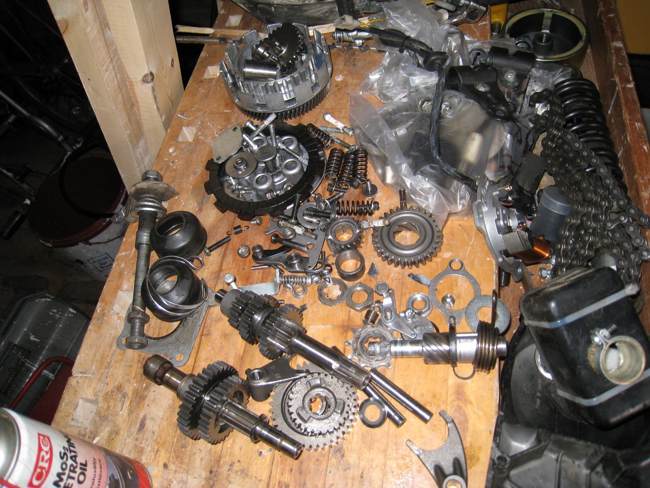 25.6.2008. Ensimmäistä kertaa sykkösen kone purettuna, ikinä. Räjäytyskuvien avulla tuosta selvittiin ilman ongelmia. :) Ja kuvassa näkyvä CRC Penetrating Oil auttaa kiinniruostuneisiin osiin.