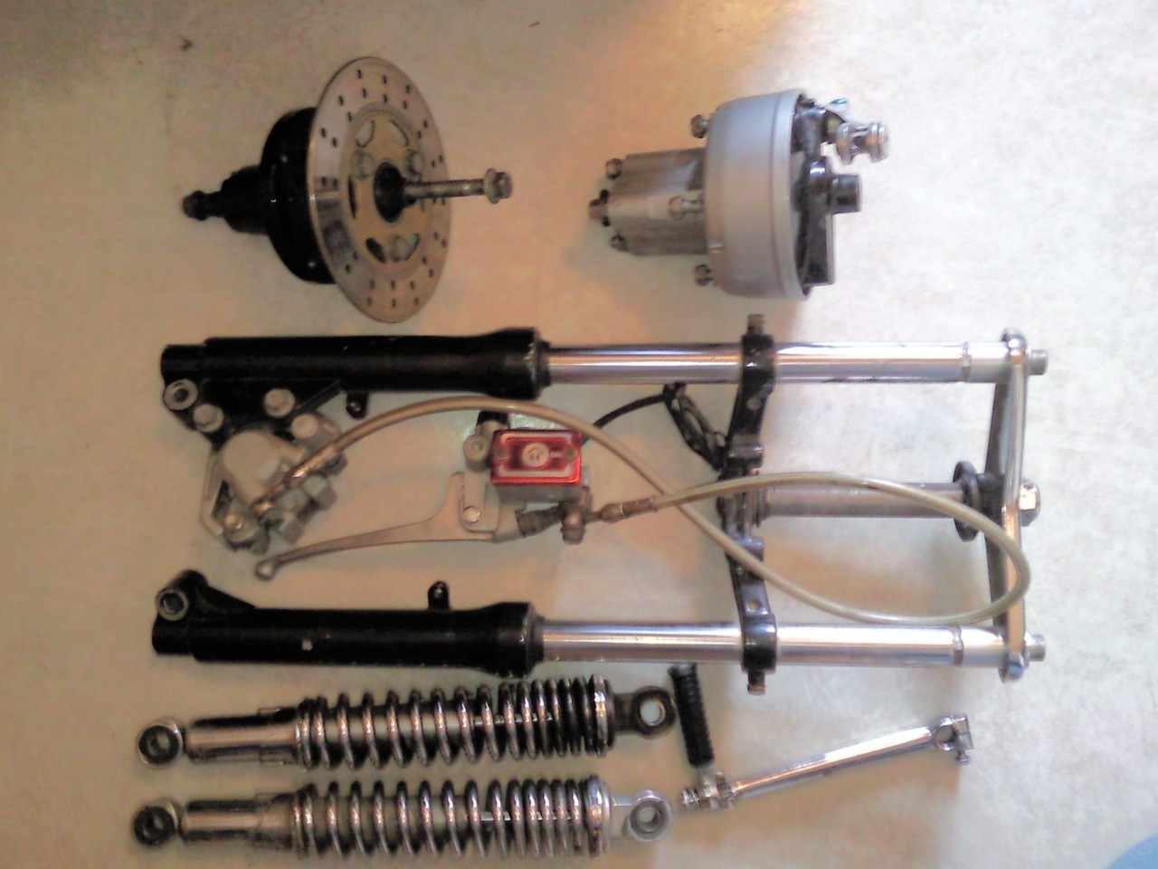 no nyt tuli vähän palikkaa manaan. Hopperin levyjarrullinen keula, takarenkaan keskiö, kromiset koro iskarit, käynnistys poljin. pitäis taas pärjätä jonki aikaa, vielä tulee heidenaut.