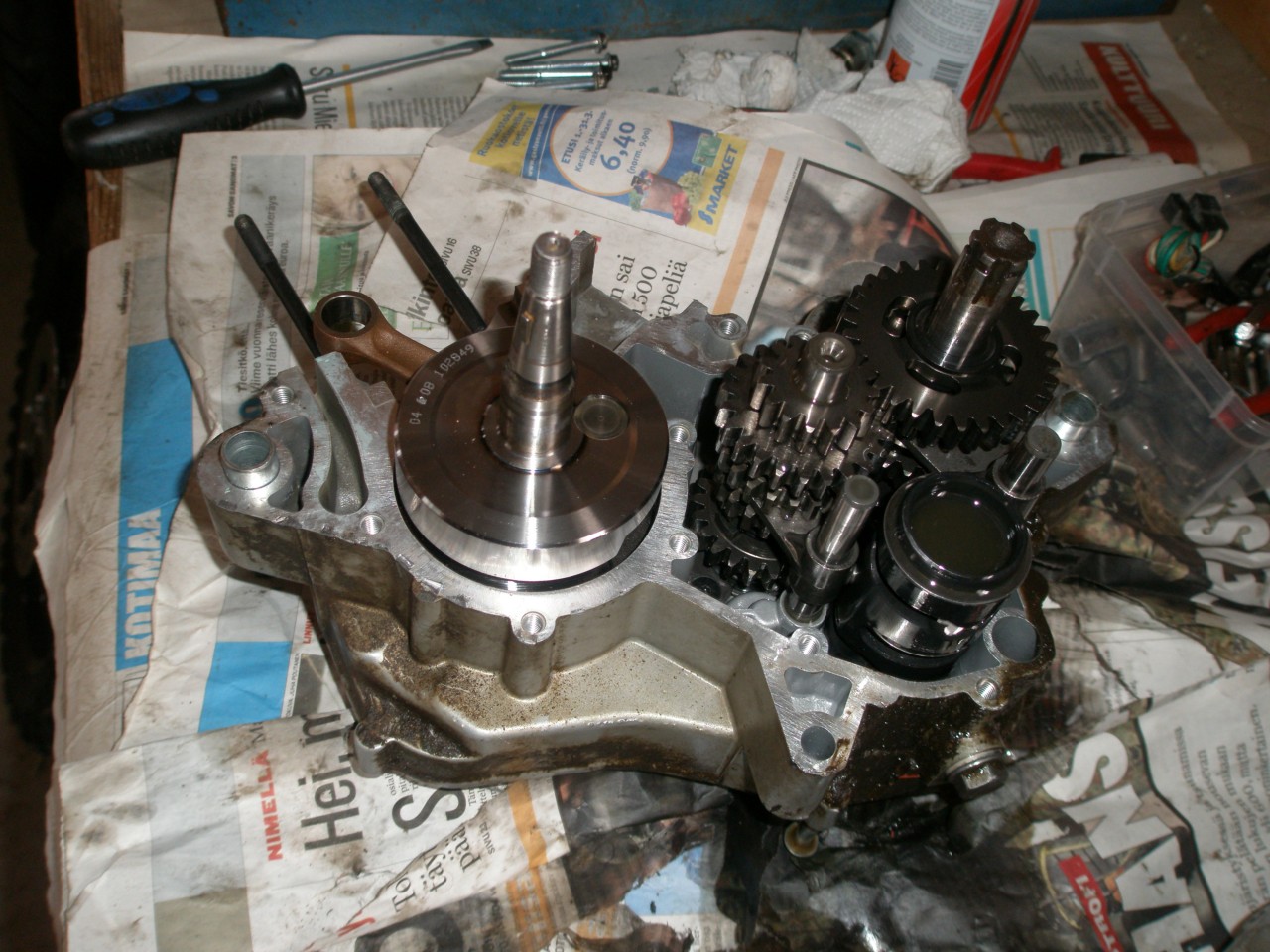 Itellä seissy kone muutaman viikon odottamassa että lohkot avattaisiin, ku muutaman kerran olen sitä koittanu kumivasaran kanssa auki muttai millää aukee. Milläköhän sää mahoit hakata kampiakselin pää...