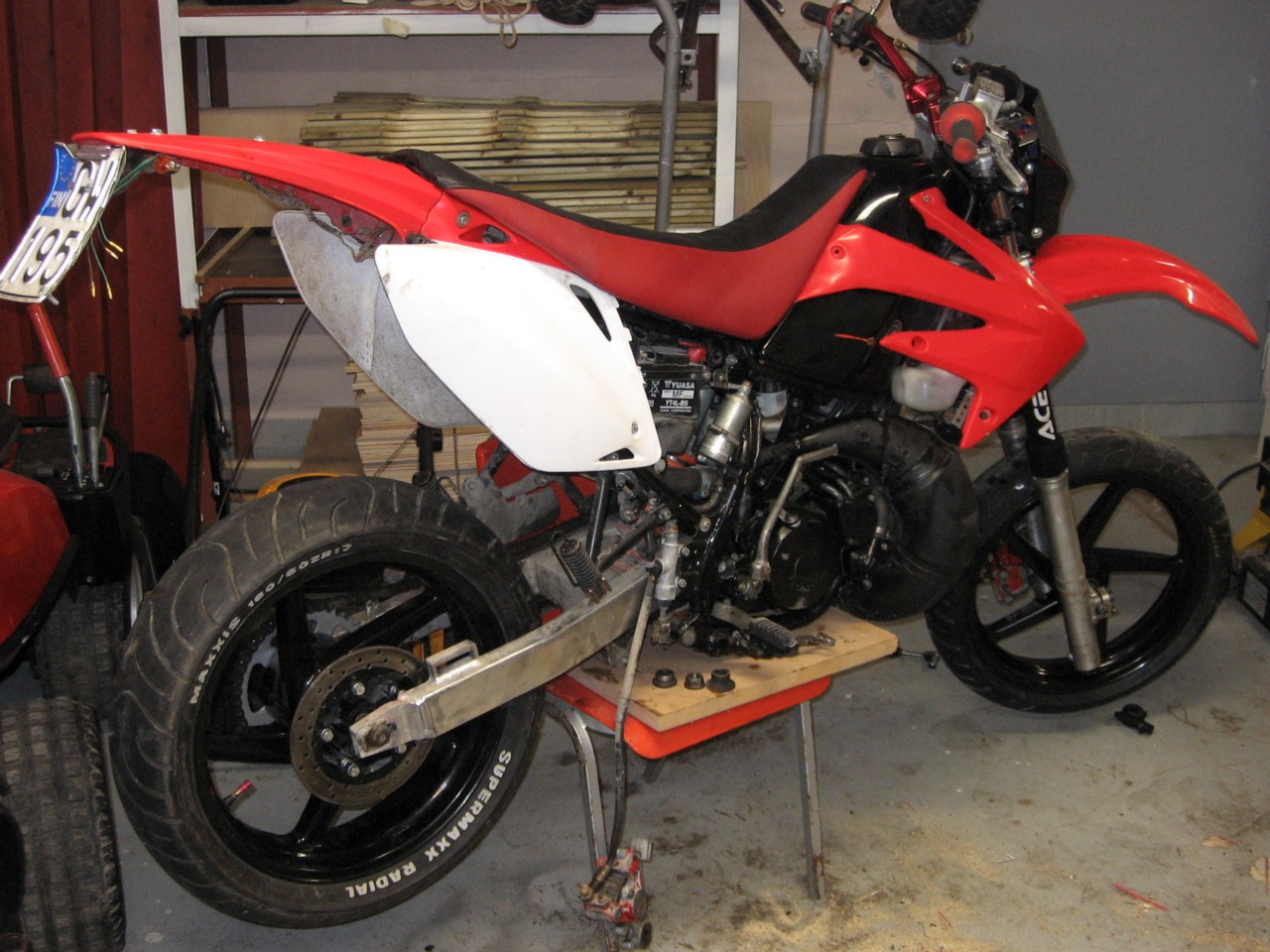 Räsän vanteet on, etujarrulle mulle oli valmiiks adapteri vanhoista vanteista ja sit vaa holkeilla kattelin levyn kohillee palojen väliin suunnillee, vähän joutu tosta takajarrun satulasta hioo tavara...