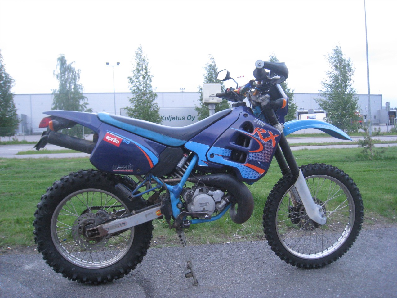 Armottomat jöötit, takana 140/80-18" ja edessä 90/90-21". Justiinsa hätäsesti keskijalan pituus riitti. Senverran muhkeat nakit että takarengas hinkkaa äänenvaimentimeen töyssyissä. Rehellisesti karvan verran liian suuret kumit, 130/80 voisi olla täydellinen. Nämä ovat siis ne Bilteman enduro-renkaat