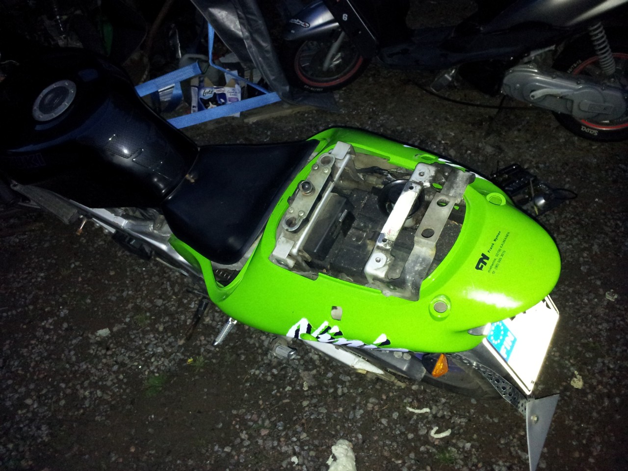 Eipä oo tyhjää tilaa nimeksikään, ottaa jäähdytysneste säiliö ja olysäiliö kiinni, pitää pienentää niitä varmaan. Jos omaan meinaat laittaa kannattaa ottaa joku edestä vähän leveämpi perä.