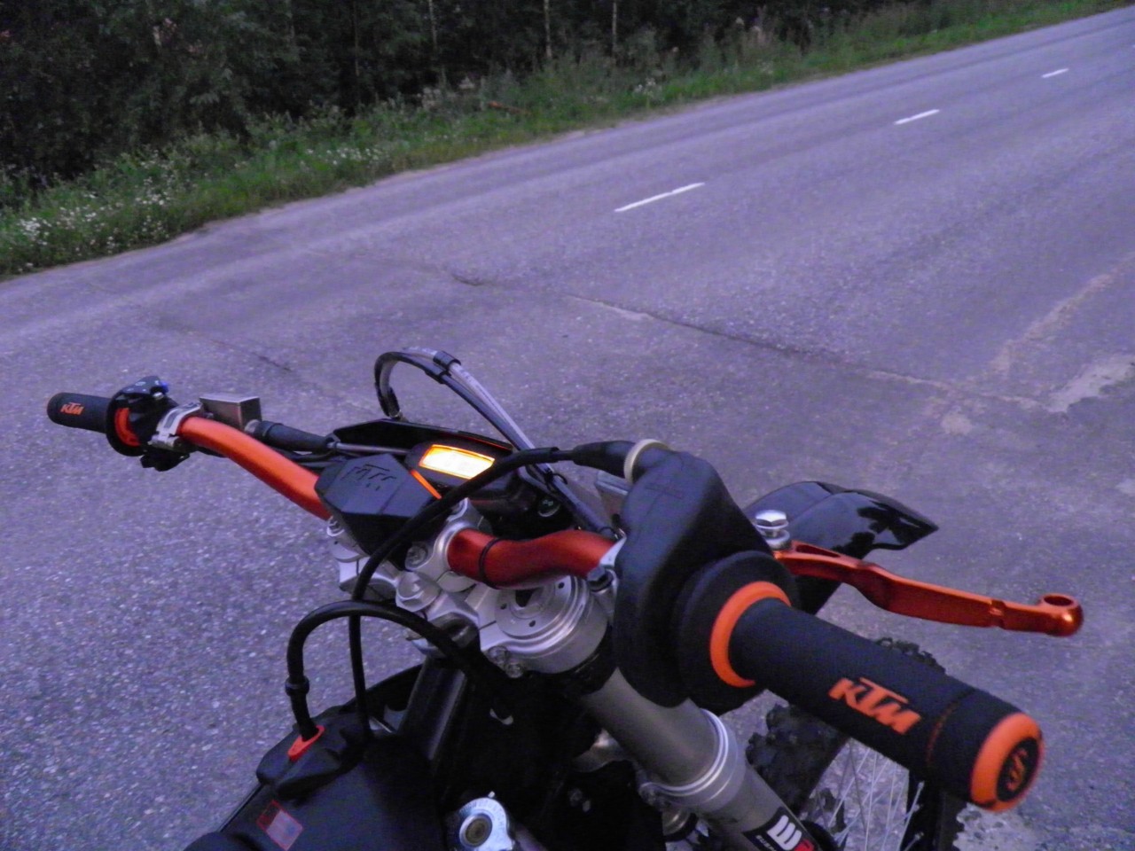 Motokeitaalta mustat KTM:n omat Powerparts tupit, tanko, kytkinkahva ja jarrukahva.