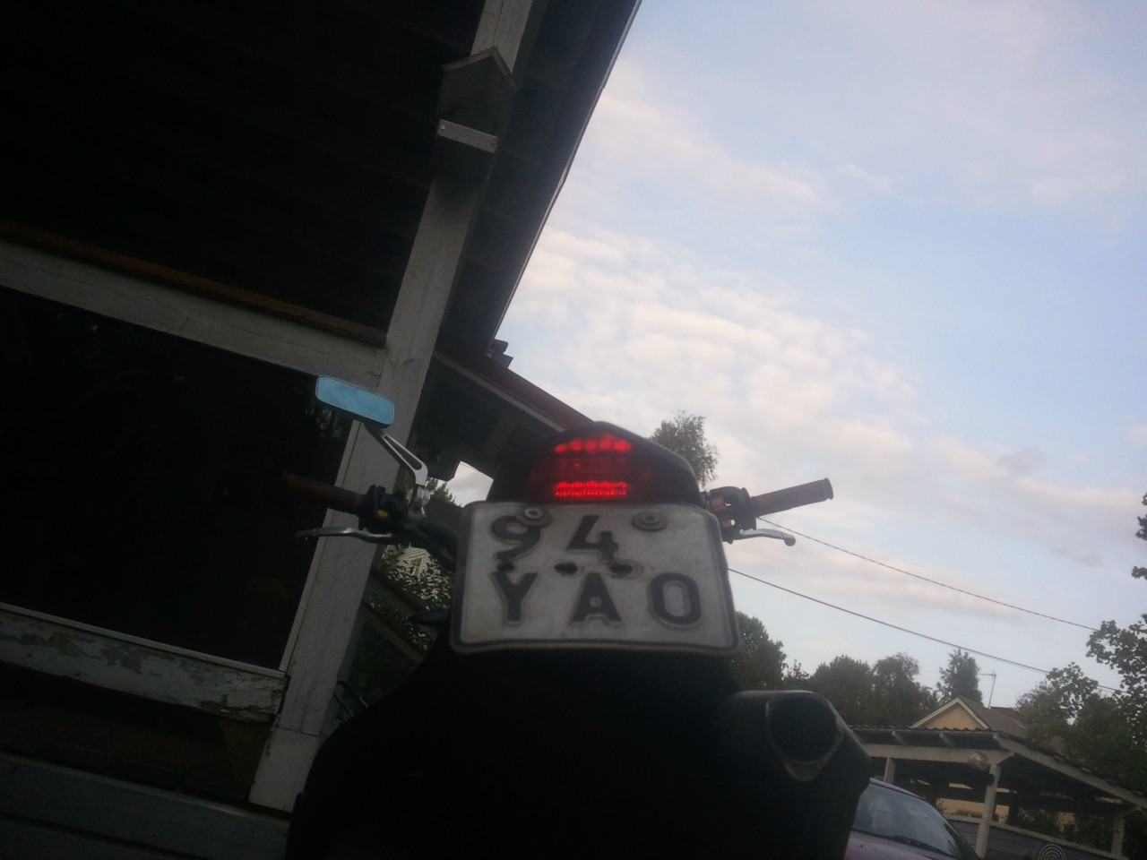 Nooo.... Iskä jokin aika sitten vetäs painepesurilla mopon putsaaks.. (kuvat on otettu hetki sen jälkeen..) pakoputkesta(äänenvaimentimesta) lähti päältä kai kuumankestomaalit (jos sellaisia siinä ede...