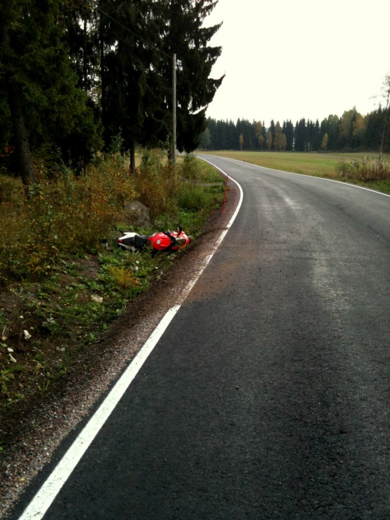 Kaveri vetäs saman mutkan piikki aikoina derbi gpr:llä pitkäks, ite menin edessä 10km/h kovempaa ja työnsin vaa mutkan puoleista kahvaa ni taittu ihan hyvin =)
