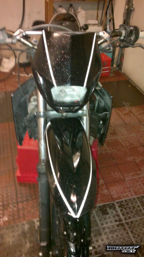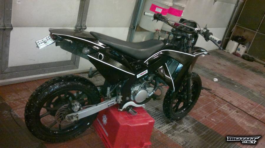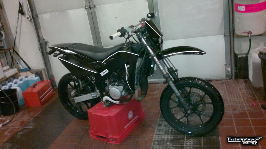 Mopo maalattu juuri kiiltävällämustalla, missä kiiltäviä valkoisia raitoja ja lakka missä seassa kimalle jauhoa. Mopo menee lähi aikoina 10tkm huoltoon.