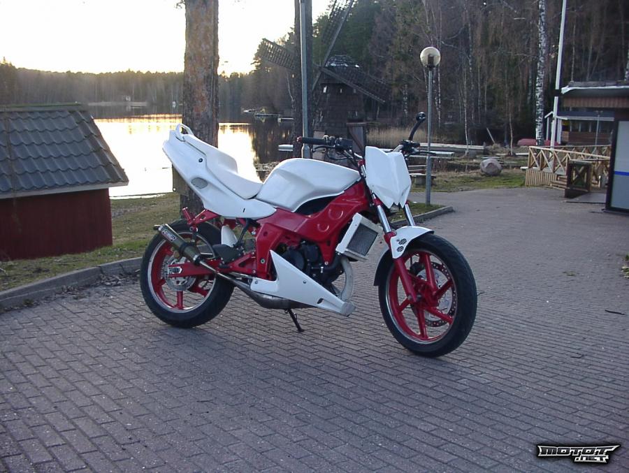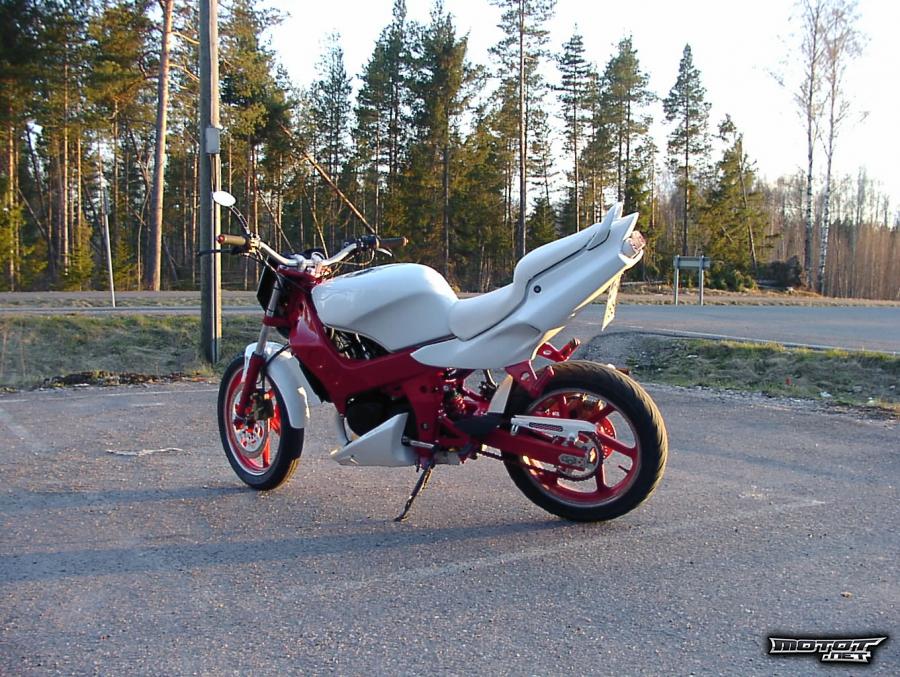 Eli myyntiin tommonen fighter nsr. pyörä rakennettu viime talvena melkeempä kokonaan uudestaan. runko maalattu punaiseksi automaalilla ja katteet on maalautettu automaalaamossa valkoiseksi. perää korotettu, alakatetta tehty ja muutenkin tuunailtu omaan silmään mieleiseksi :) kulkupuolesta vastaa isompi malossin sylinteri sarja, keihinin 36 millinen kaasari ja gianellin tehoputki. eli kulkua riittää! koneeseen vaihdettiin kaikki laakerit, stefat ja tiivisteet. myös kytkin levyt ja jäykemmät kytkin jouset. tuorevoitelu pois käytöstä! vaihdossa voin ottaa mitä vaan, mutta väliä en ala maksamaan! vaihtohinta suurempi kuin suoramyynti hinta!! (HUOM! jos ehdotat vaihtoa/ostat suoraan, kysy isiltä lupa ettei käy niinkuin yleensä, että kaupat on sovittu ja sitten et saakkaan vaihtaa/ostaa) ja välirahan pitää löytyä heti! jos luit tänne asti painappa peukkua :)