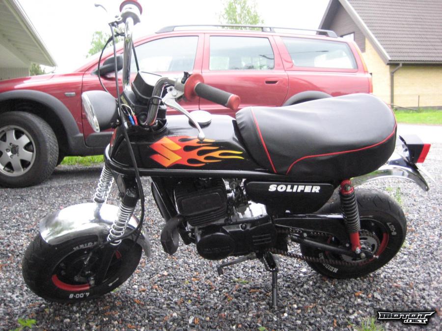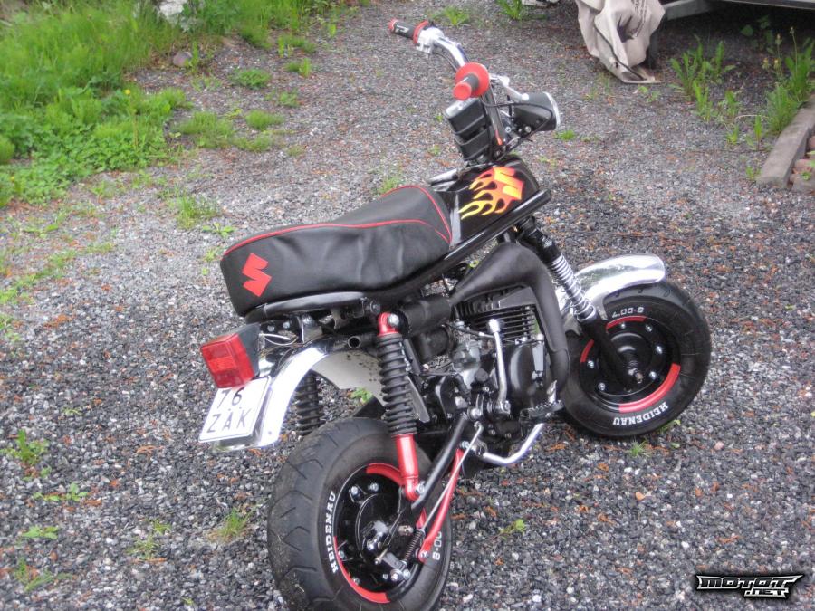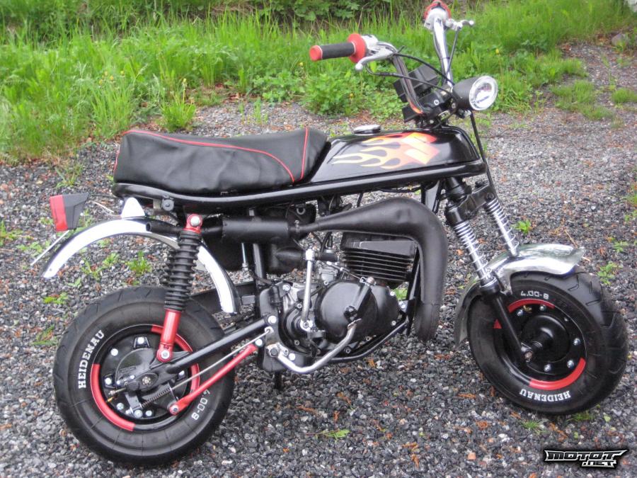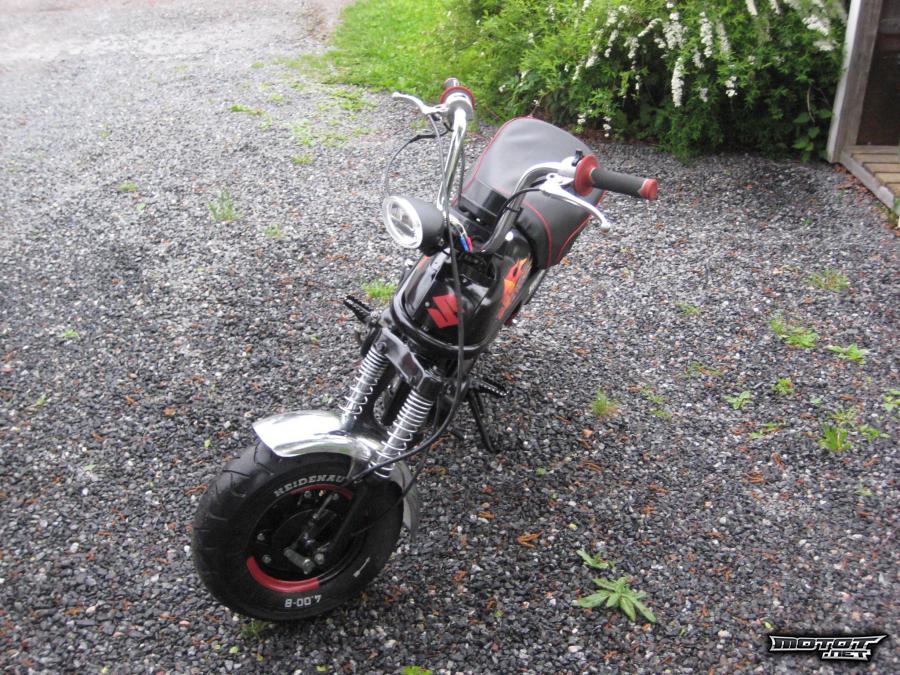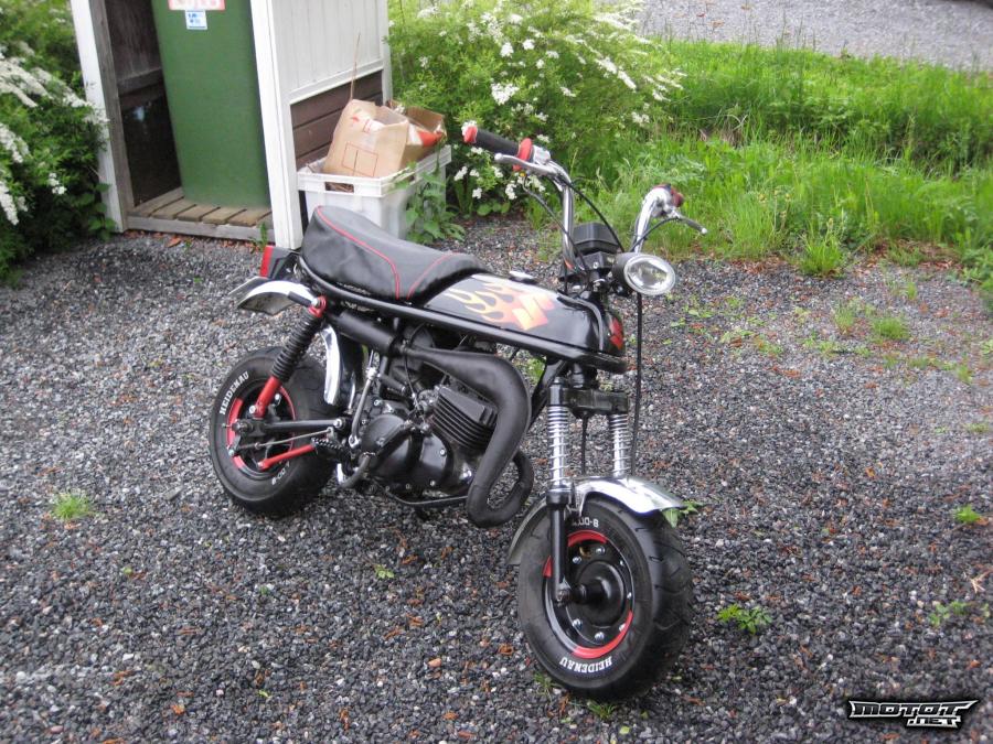 Mopoa eteenpäin vie 60cc ja luhaon tehari. Putki hiottu ja maalattu 600C kuumakestomaalilla. Äänenvaimentimeen vaihdettu juuri ääneneristysvillat. Kulkee 60km/h.