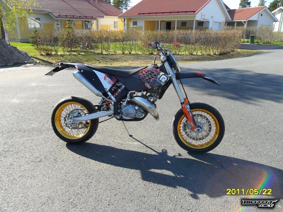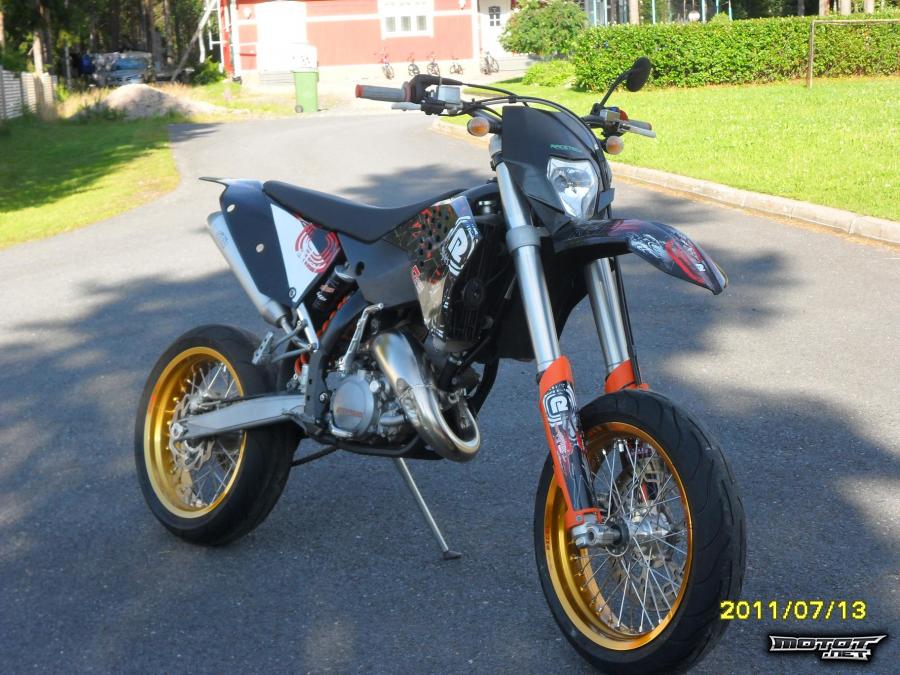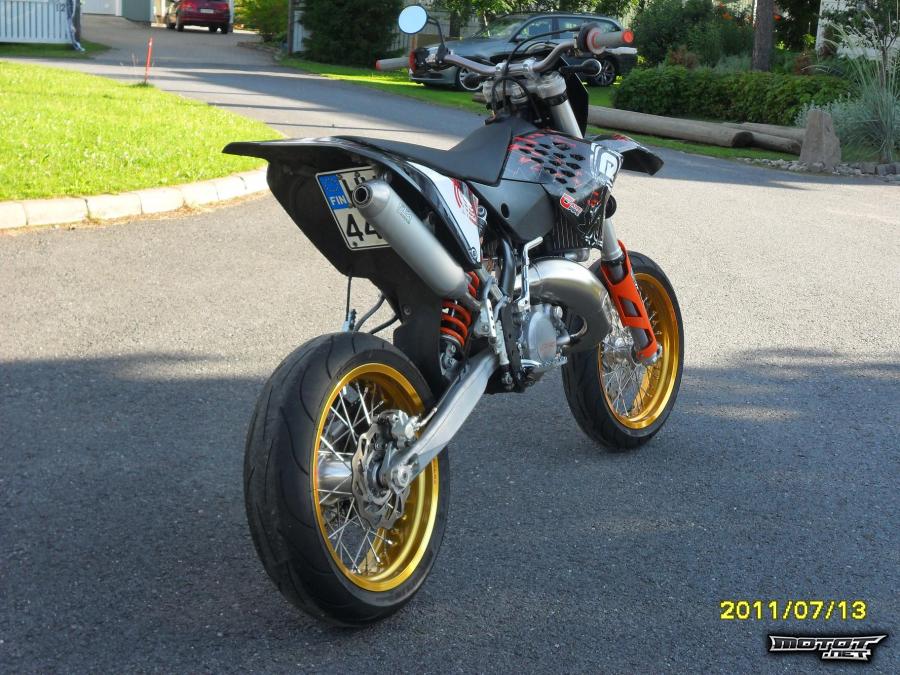 Pyörään laitettu musta katesarja ja race-styles tarrasarja, VIRTALUKKO, sytytyskartan katkaisija, matkustajan jalkatapit, exelin kultaiset supermotovanteet + muuta kulutusosaa