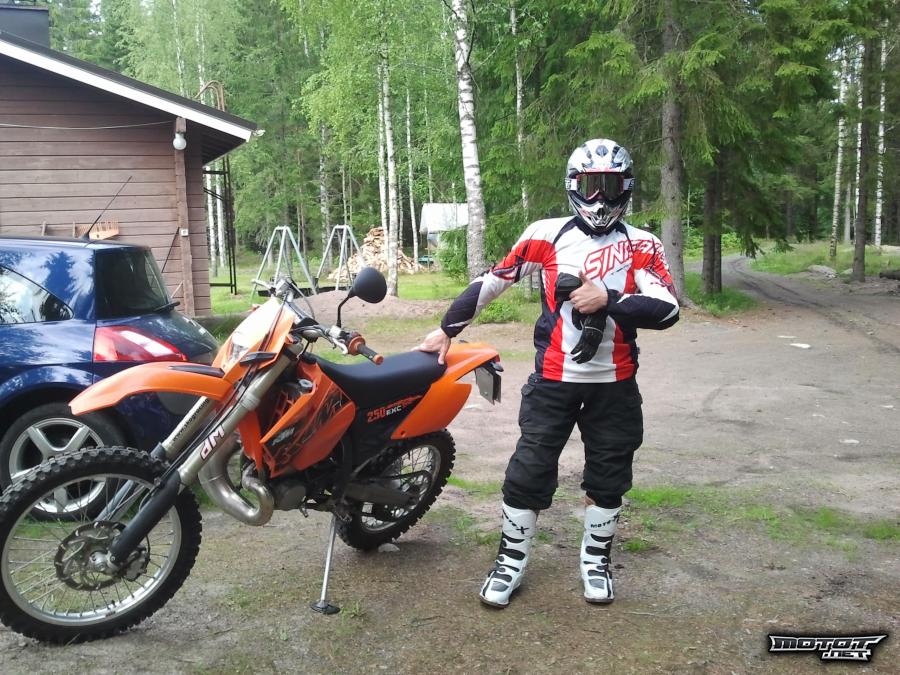 Myydään täystehoinen, valkokilpinen enduro KTM 250 EXC. Pyörässä parhaillaan crossimuovit paikoillaan. Pyörällä ajettu 13 116km/0352,7 tuntia. Valmis ajoon. Hyllyssä renkaita ja enduro-osat. Lisäksi myynnissä vähän käytettyjä ajovarusteita. Kuitit huolloista. Vm. 2005. Mahdollisesti vaihto BMW 325 E36, Opel Omega tai vastaavanlaiset.