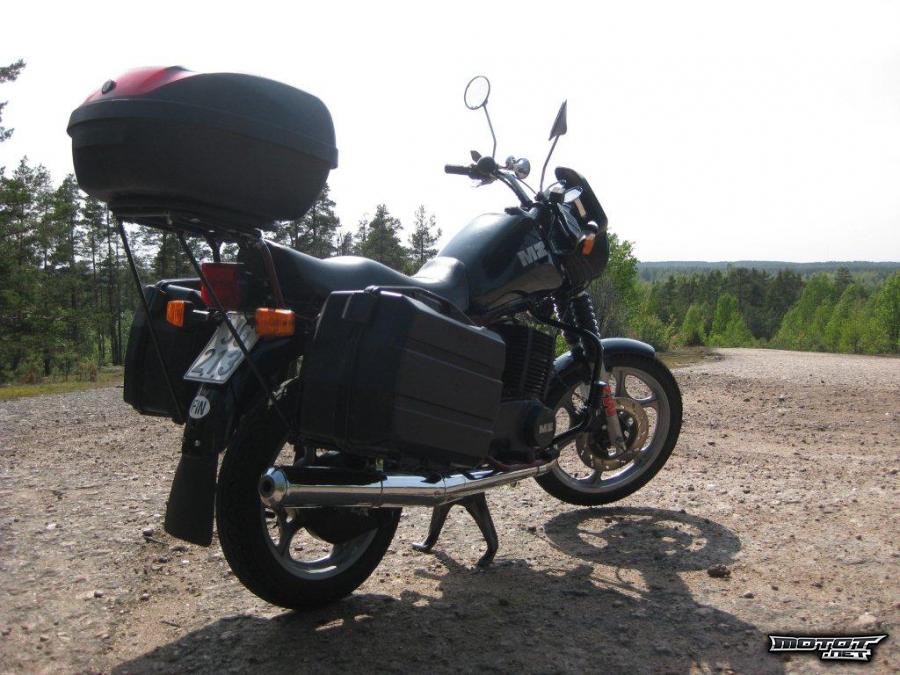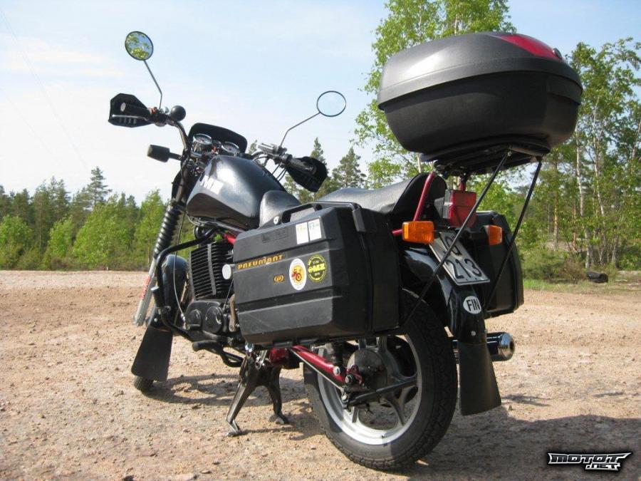 Pyörä on siis täysin valmis vaikka Vladivostokin reissulle. Kaikki on joka nippeliä myöden rasvattu ja tarkastettu. Mukava peli ajaa, kun ei tärise ajossa lainkaan ja voimaa on riittävästi vaikka moottoritiellekin(jos sinne välttämättä haluaa). Ainoa syy miksi myyn on se, että ajan nykyisin lähes yksinomaan 2-päällä pitkiäkin matkoja ja tilat tahtovat loppua kesken. Yksin ajavalle aivan loistava matkapyörä isolla m:llä! Tekniikka äärimäisen yksinkertaista 1-syl 2-t, 1-kaasutin. Osia saa myöskin erittäin hyvin ja ne ovat edullisia. Näillä on ajettu todistetusti jopa 100 000km konetta avaamatta!