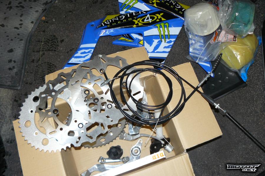 Varaosat mukaan: jarrulevyt eteen + taakse, 2 kpl takarattaita, eturatas, alkuperäiset ketjut, kaasu ja kytkinvaijerit, etulokari, takalokari, sivumuovit, numerokilvet, bensatankki, satula, ilman putsareita jne