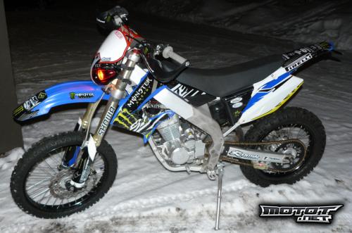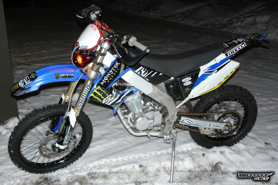 Moottori 230cc nelitahti, ilmajäähdytteinen. Vastaava kone kun Honda CRF 230. Käynnistys: sähkö startti/poljin.