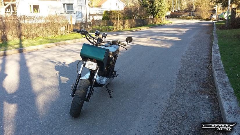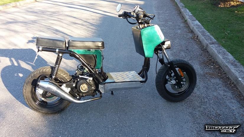 Tästä vähän rankemmalla kädellä customoitua kiinaskobaa. Rakennettu Honda Ruckus tyyliin. Ostettu raatona 2015 elokuussa ja viime syksynä ensimmäiset koeajot ajettu. Ei tietoa kuinka paljon ajettu oikeasti, mutta rakentamisen jälkeen ajettu tuo 70km. Hinta on mikä on mutta osat + vuodatetut veri- sekä hikipisarat, kyyneleitä unohtamatta ovat vähintäänkin tuon arvoisia. Tosiostajalle vaihdetaan öljyt ja pistetään tankki täyteen. Tinkivaraakin löytyy.