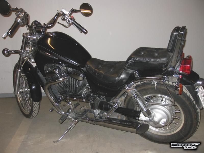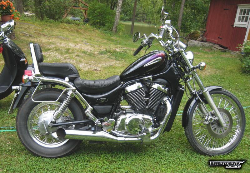 Hyväkuntoinen customi heti ajoon. Varusteena laukkuraudat,jalkatappien siirtosarja takana ja ajoplexi. Uudehkot renkaat. Väri Musta - Metalliväri.