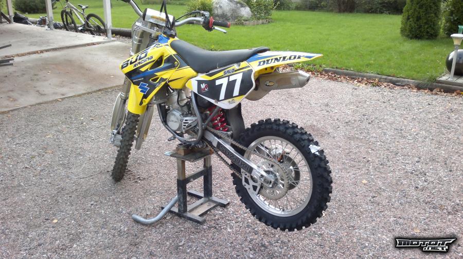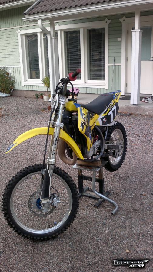 Suiza RM85l, täyden konerempan jälkeen ajettu 5h.Runko on yhden kesän ajettu(2010), vahvistettu heti uutena, ei hitsailtu jälkikäteen. Kone on alunperi 2009 mallissa ollut kiinni. Fattbarr tanko, taittuvat kahvat, pikakaasu(normaali kahvakin löytyy) Laitettu rempan yhteydessä mäntä, kiertokanki kampiakseli kaikki koneen laakerit ja stefat, yms. Svingin laakerit uusittu samalla. Svingissä ja linkuissa rasvanipat. Mukaan kolmet muovit, toinen tankki, paljon varaosia mm, kampiakseli kiertokanki paketti, uusi mäntäsarja, kiertokanki petilaakerit, V-forsen läppiä, rattaita, jarrulevyjä, tiivistesarjoja, renkaita, toinen HGS alkukäyrä. yms, yms. Lisähinnnasta (300€ ) mukaan toiset renkaat vanteineen talonin navoilla. Tästä valmis kisapaketti kaudelle 2012. Pyörä myydään kerhojoukkuekisan jälkeen. (02.10-2011)PYÖRÄ ON KUNNOSSA!!! Joo ja löytyy piikkikumit myös. Etuputket huollettu Topi-servisellä 27-09-2011