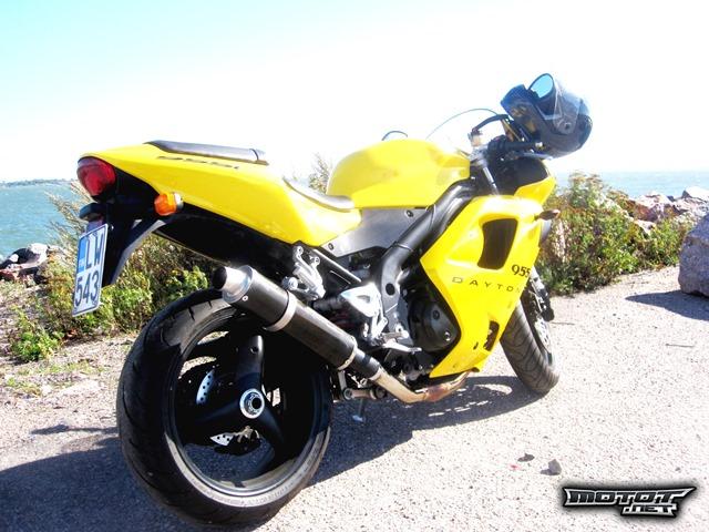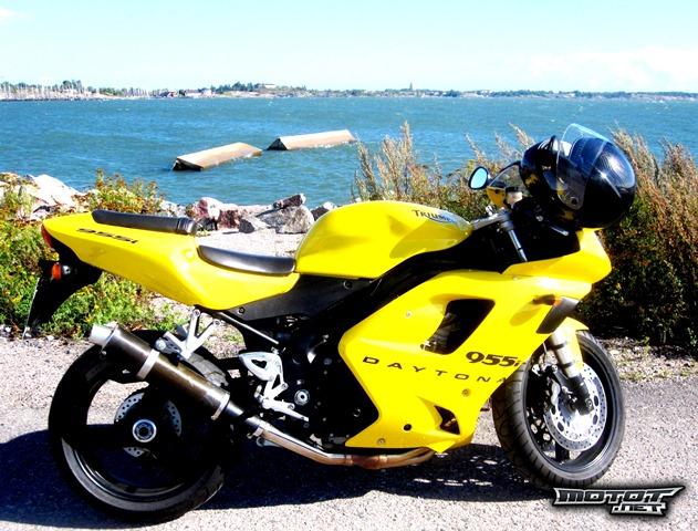 Myydään hieno yksilö, lähes uudenveroinen Triumph Daytona 955i, vm.2005, 955cm3. Mittarissa 19th300km. Hyvin pidetty, tämä yksilö tuotu alunperin USAsta Kaliforniasta Suomeen. Vääntöä löytyy, tehoa riittävästi vaativammallekin pyöräilijälle. Viimeisin kuntotarkistus suoritettu Helsingin merkkihuoltoliikkeessä 15.4.2013, ei puutteita. Väri Racing Yellow.