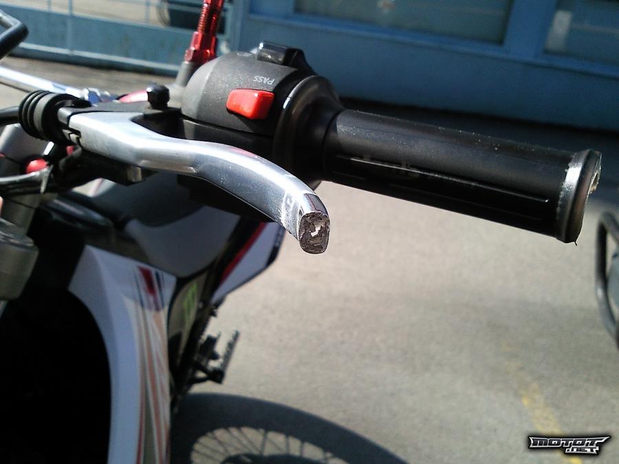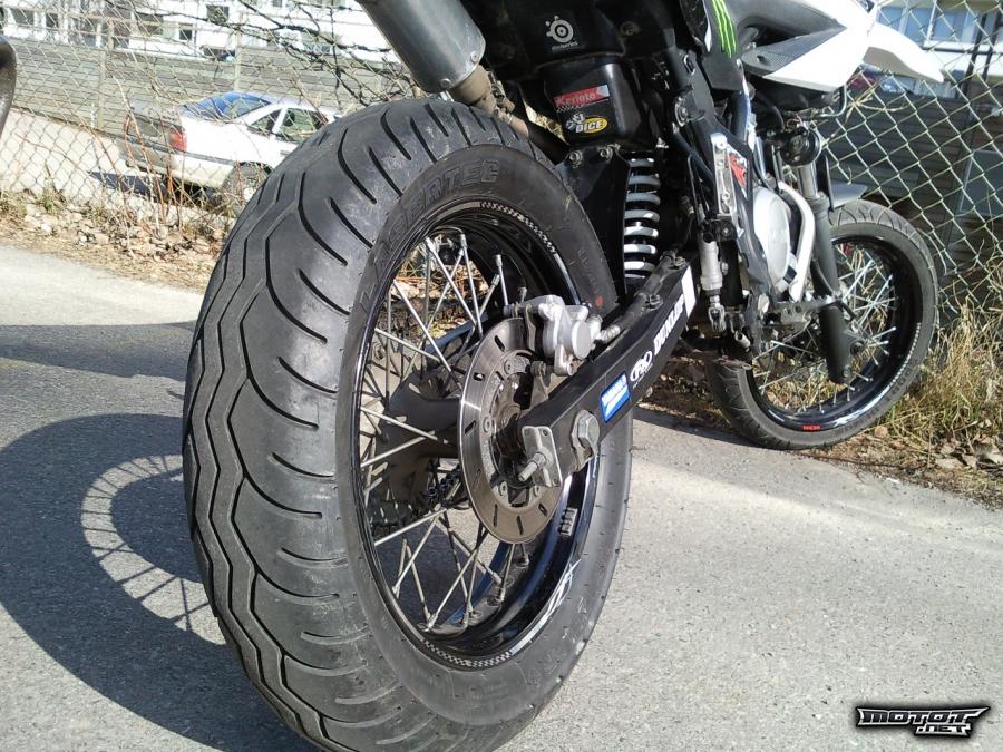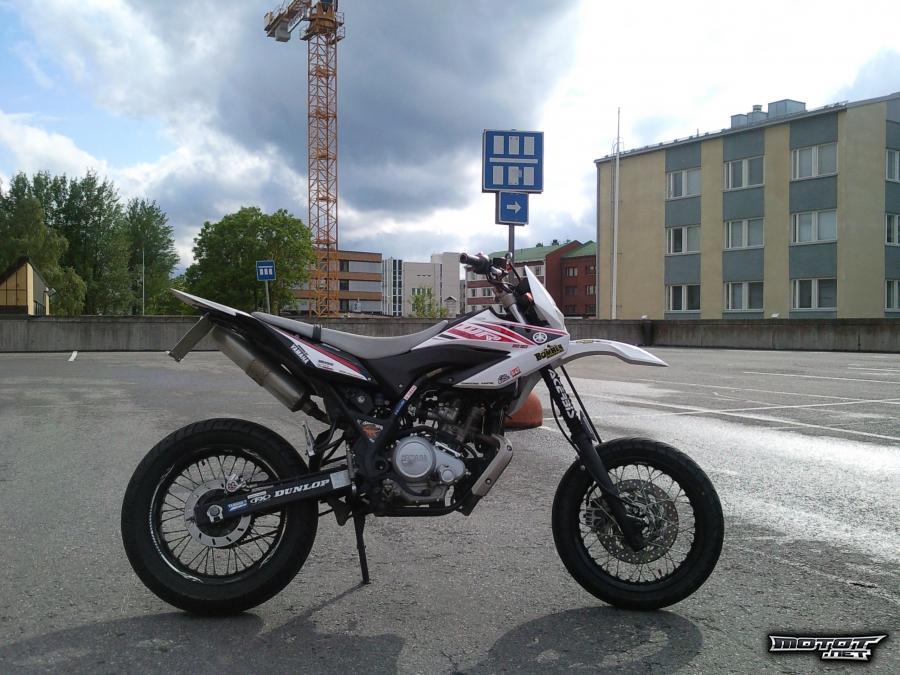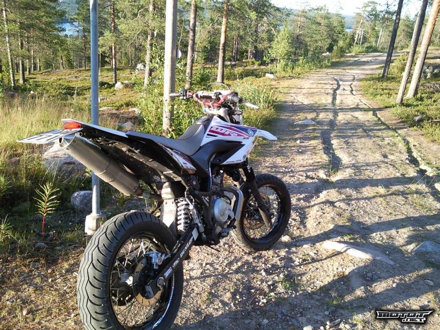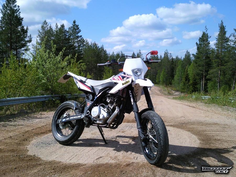 Nyt siis syksyn loppu ajokeleille mainio nelari supermoto. Pieni ruokainen, noin 3.5l/100km syövä piikki. Näppärästi tällä onnistuu myös kikkailu, tiedoksi niille, joita se kiinnostaa. Möreät, ehkä hieman isompaa pyörää muistuttavat äänet. Ei ole vikoja, käytönjälkiä löytyy, pieniä naarmuja mutta ei kovin näkyviä ellei tarkemmin ala niitä tiirustelemaan. Kytkinkahva päästä poikki, en ole vaihtanut koska ei ole ollut tarvetta kun vakiokahva muutenkin aika pitkähkö.