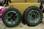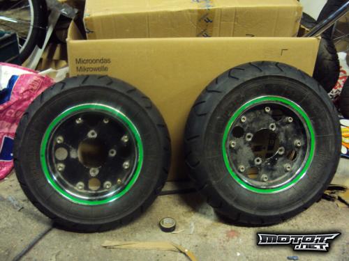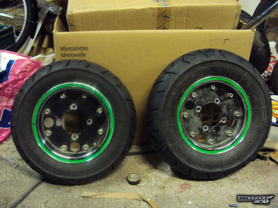 Mankin vannelautaset, mustat keskiösat ja kormiset reunat. Musta maali hieman kulahtanut, mutta maalien poistolla alta löytyy kromipintaa! Vanneteippejä ei ole enään, otin pois.