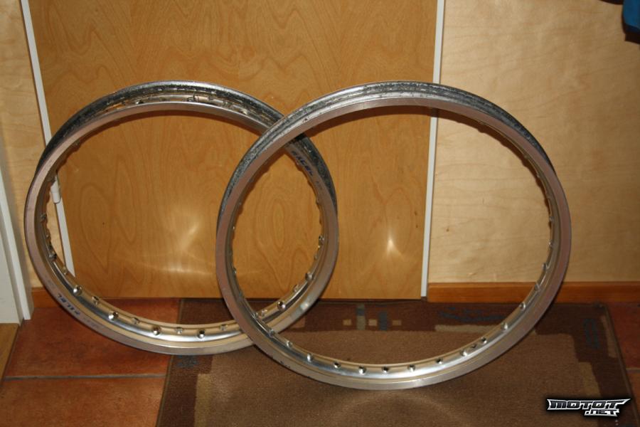 Eli myynnissä olisi Excelin kehät. Etuvanne 1,6"x21" ja takavanne 2,15"x18". Etuvanteessa pieni lommo, ei vaikuta ajossa. Pinnat ja nippelit löytyy myös.
