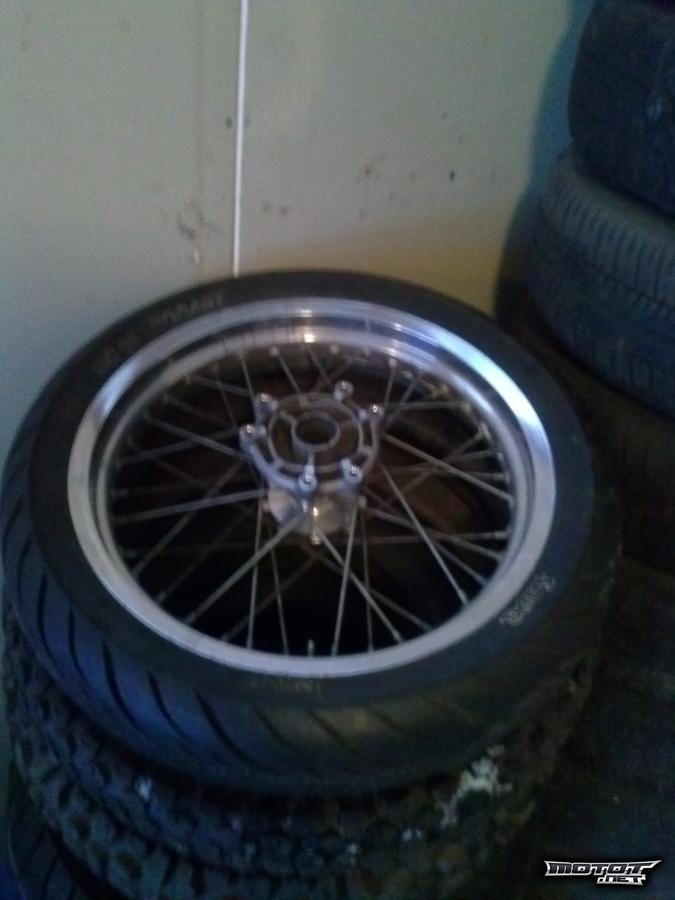 Yamaha DTn takavanne - krominen ja muutenkin hyväkuntoinen, paitsi toista laakeripesää pitää hieman fiksailla. Lisähinnasta löytyy myös hyväkuntoinen Pirellin kumi jos on tarvetta.