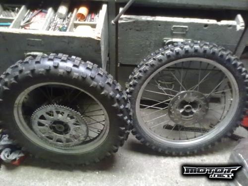 Nurkista pyörimästä Derbiin ja laakereiden vaihdolla myös muuhunkin laitteeseen menevät 18" ja 21" endurovanteet. Rengastuksena toimii Bilteman Innovan Super endurot, joilla ajettu MAX 50km. Mukaan kuvassa näkyvät hyväkuntoiset jarrulevyt sekä 65(?)-piikkinen takaratas + laakerit. Tästä kunnon rupulikumit kesän hiekkateille! Katso myös muut ilmoitukset!!