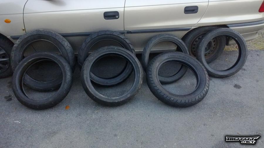 -Continental ContiMotion 130/70/18(!!) 2,5mm pintaa. Tuumakoon puolest ei mee supermotoon mutta vaikka enskaan takarenkaaksi.