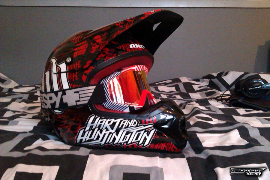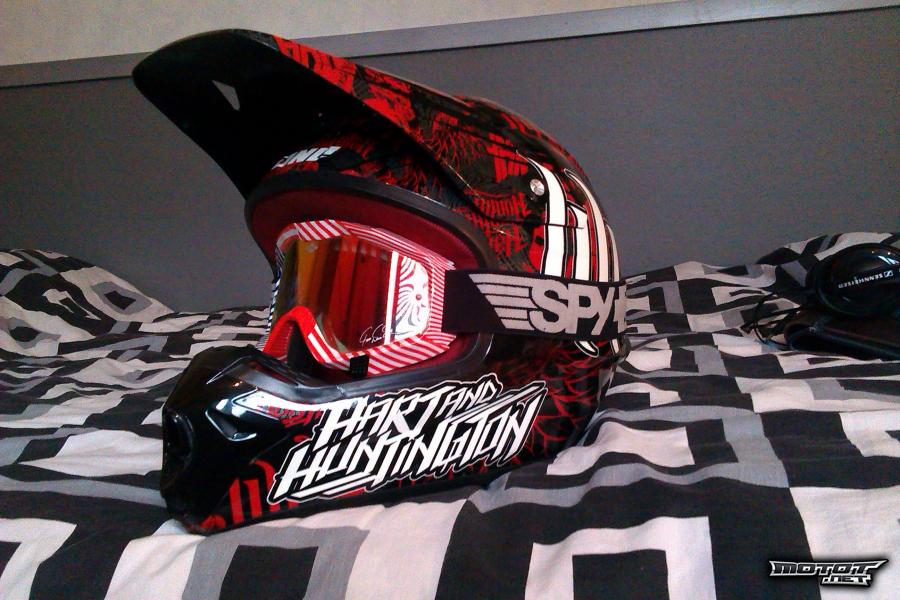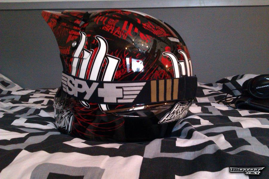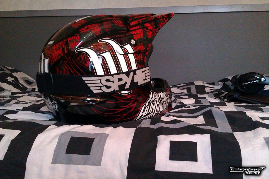 Mukaan Spyn Klutch ''Windham signature''- ajolasit punertavalla peililinssillä, mukaan myös käyttämätön kirkas linssi. Peililinssissä alareunoissa pienet ajohanskojen jättämät kulumat. Kypärään ja ajolaseihin molempiin myös säilytyspussit.
