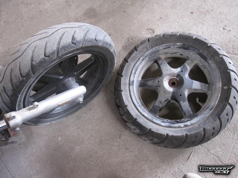 Sisäkumit ehjät ja pintaa molemmissa jonkun verran, takana enemmän.